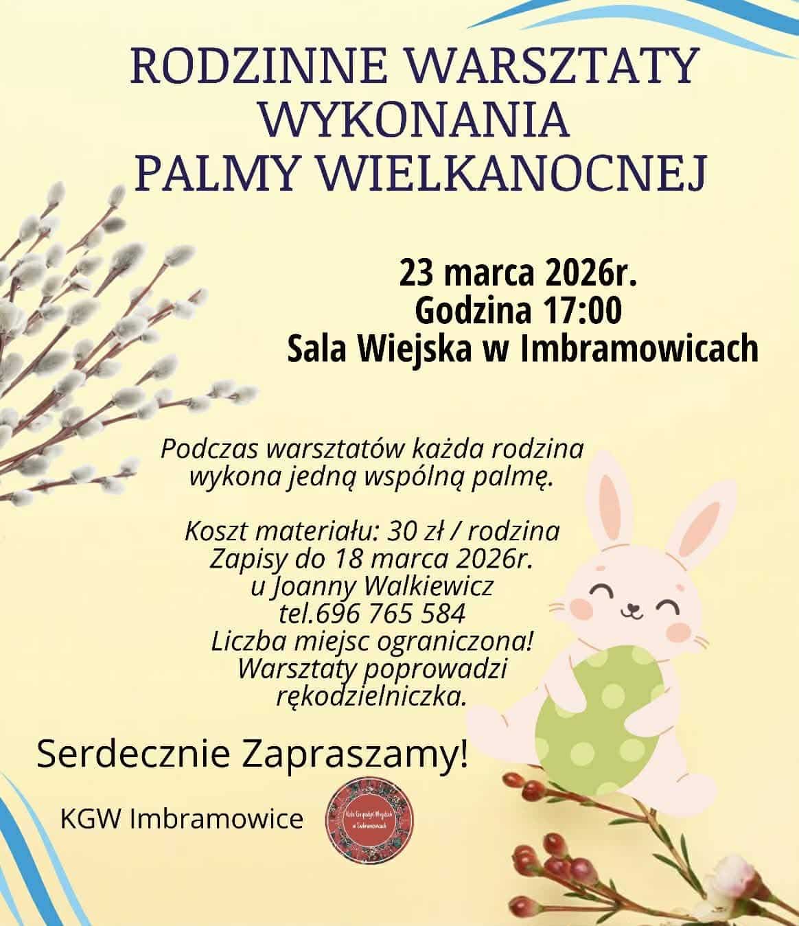 Koło Gospodyń Wiejskich w Imbramowicach zaprasza mieszkańców do udziału w wyjątkowym wydarzeniu przygotowanym z myślą o całych rodzinach. Już 23 marca 2026 roku o godzinie 17:00 w Sali Wiejskiej w Imbramowicach odbędą się rodzinne warsztaty wykonywania palmy wielkanocnej.