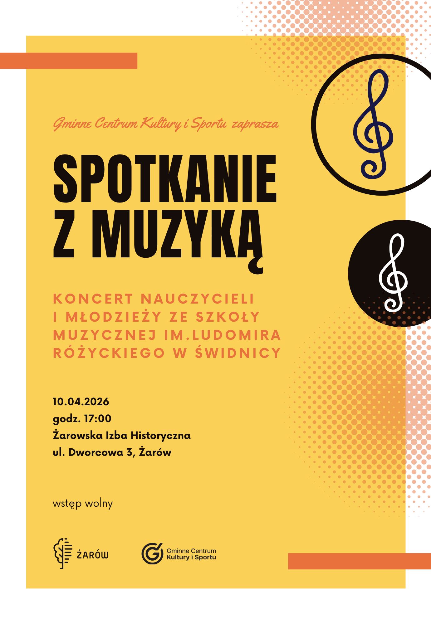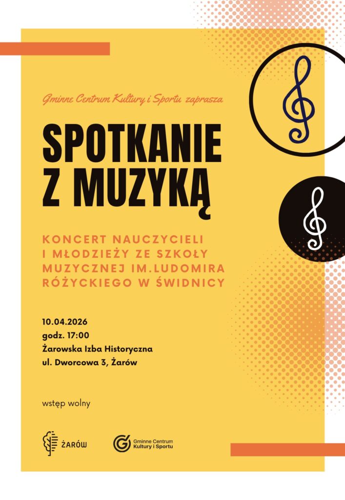 Gminne Centrum Kultury i Sportu w Żarów zaprasza mieszkańców na wyjątkowe wydarzenie muzyczne. W piątek, 10 kwietnia, w Żarowska Izba Historyczna odbędzie się koncert pod hasłem „Spotkanie z muzyką”.