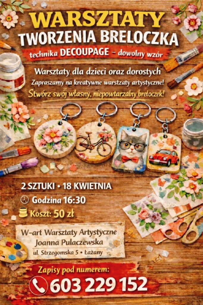 Już 18 kwietnia mieszkańcy Łażan i okolic będą mieli okazję wziąć udział w wyjątkowych warsztatach artystycznych, podczas których uczestnicy stworzą własne, niepowtarzalne breloczki. Wydarzenie skierowane jest zarówno do dzieci, jak i dorosłych, co czyni je doskonałą propozycją na kreatywne spędzenie czasu w gronie rodziny lub znajomych.